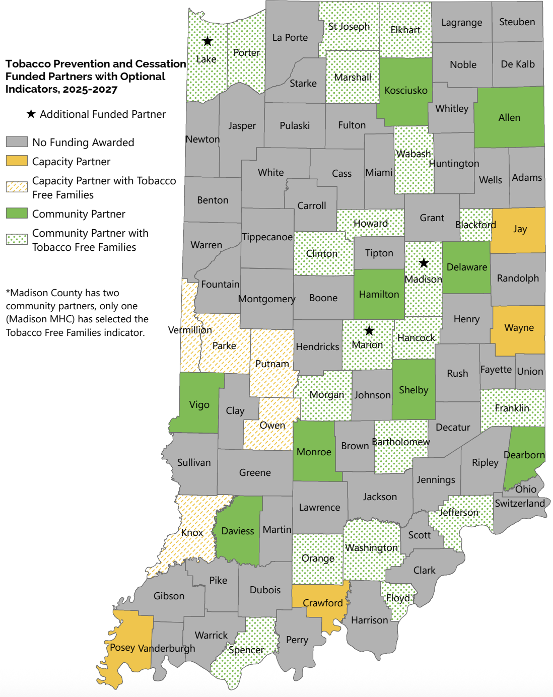 Here is the map showing the Funded Partners that will be working on the Tobacco Free Families Indicator/Breathe in the 2025-2027 grant cycle: